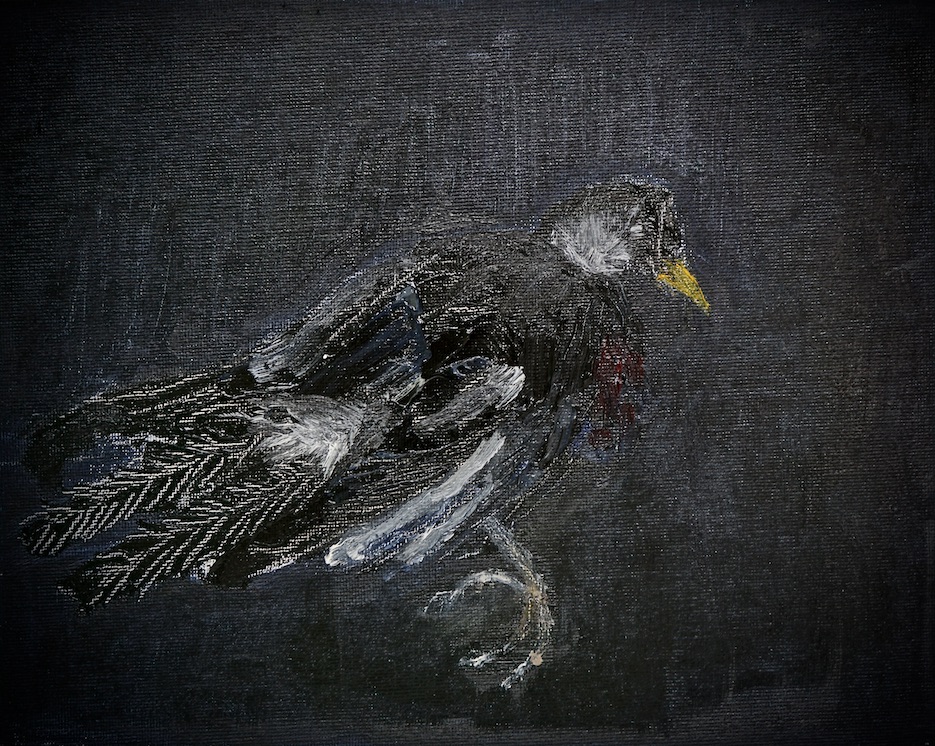 I walk through the park, down the alley, along the road. On the pavement, next to a green leaf, a black bird. The feathers are brushed back on its neck and at the base of its tail and one foot sticks out, three claws facing forward and one the other way.